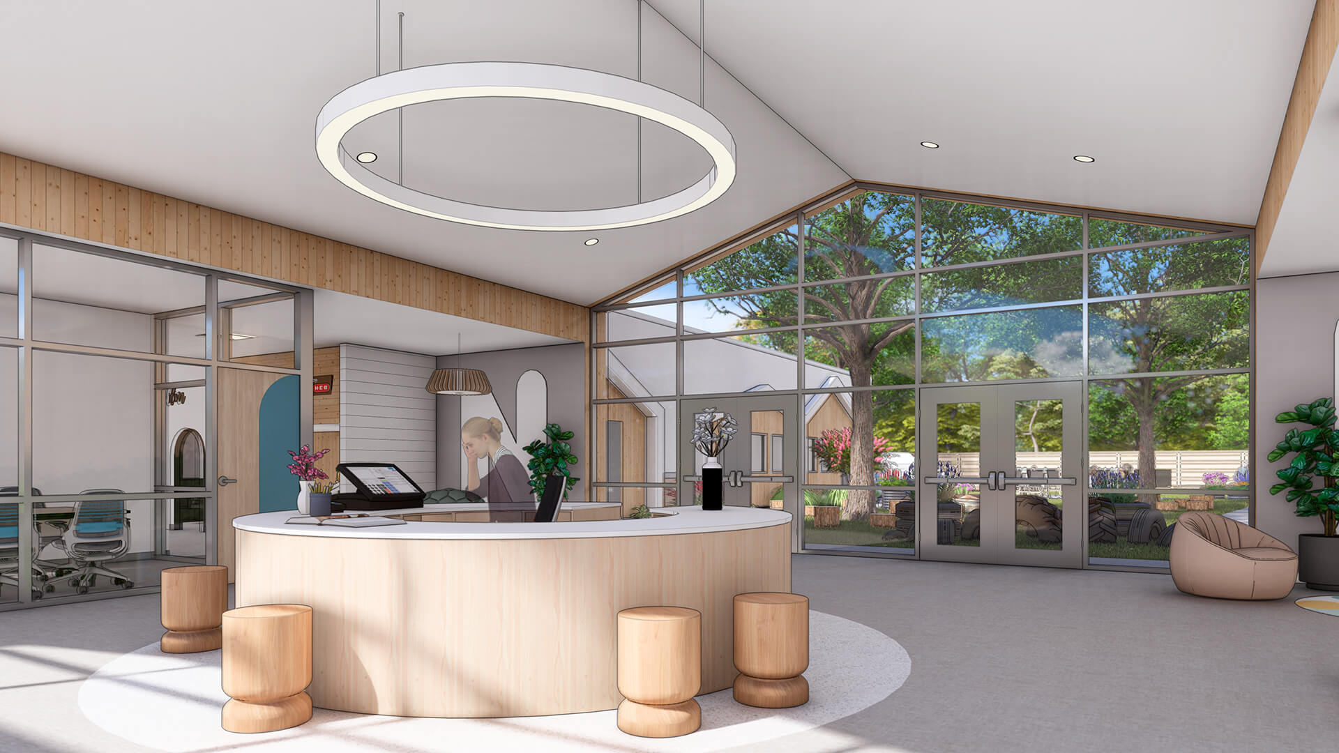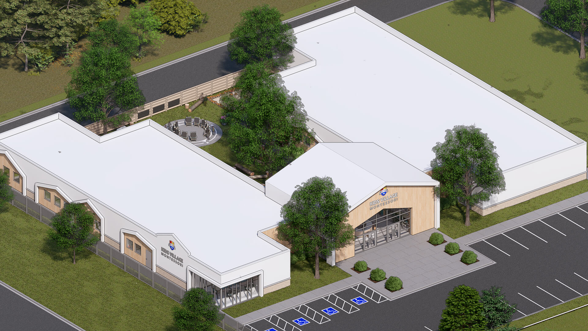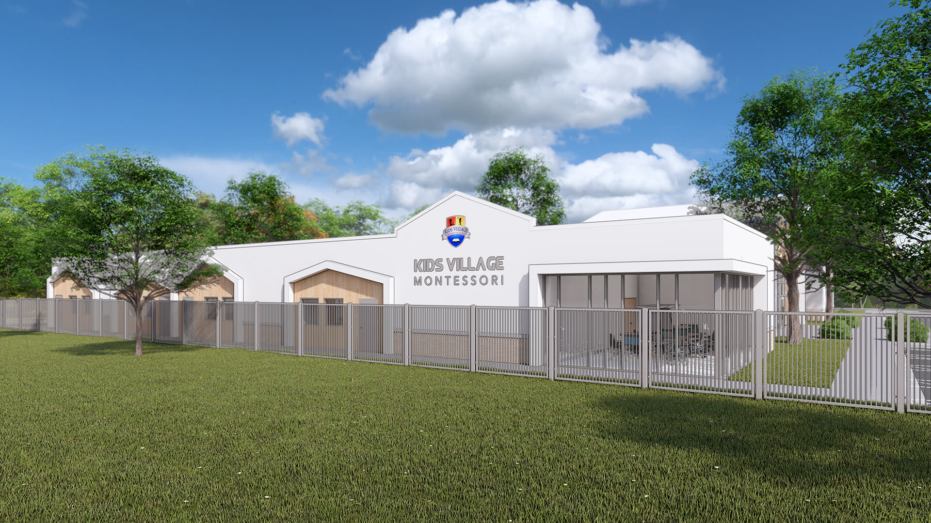 Kids Village Montessori School is designed to foster a nurturing and stimulating environment for young learners. With its welcoming façade featuring natural wood elements, large glass windows, and an open entryway, the school invites children and families into a vibrant educational space. The architecture emphasizes connection to nature, promoting a sense of community while allowing ample natural light to enhance the learning experience. Inside, thoughtfully designed classrooms support the Montessori method, encouraging exploration, creativity, and independence. The layout is conducive to collaborative learning and play, making Kids Village a perfect haven for holistic childhood development.
