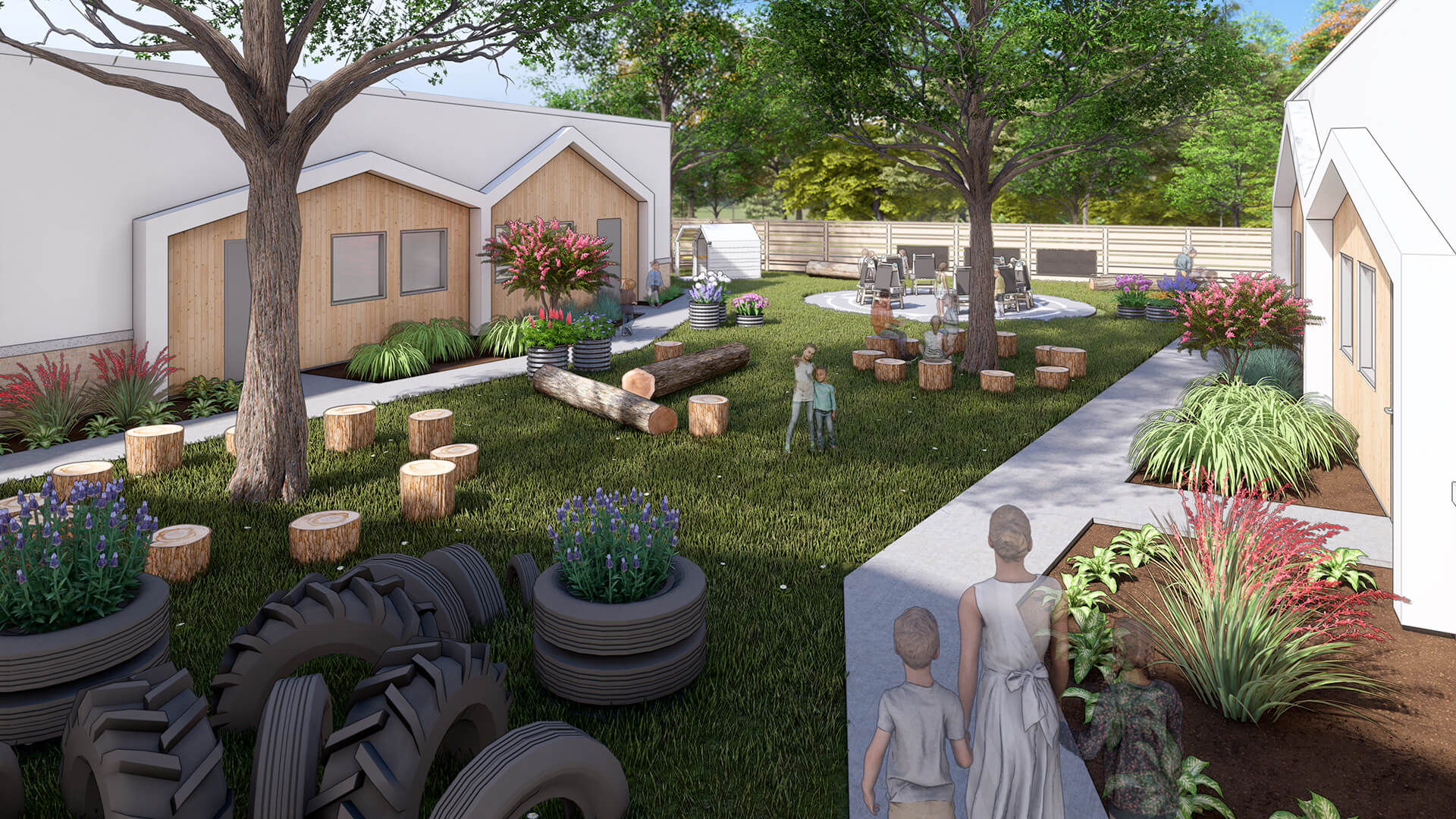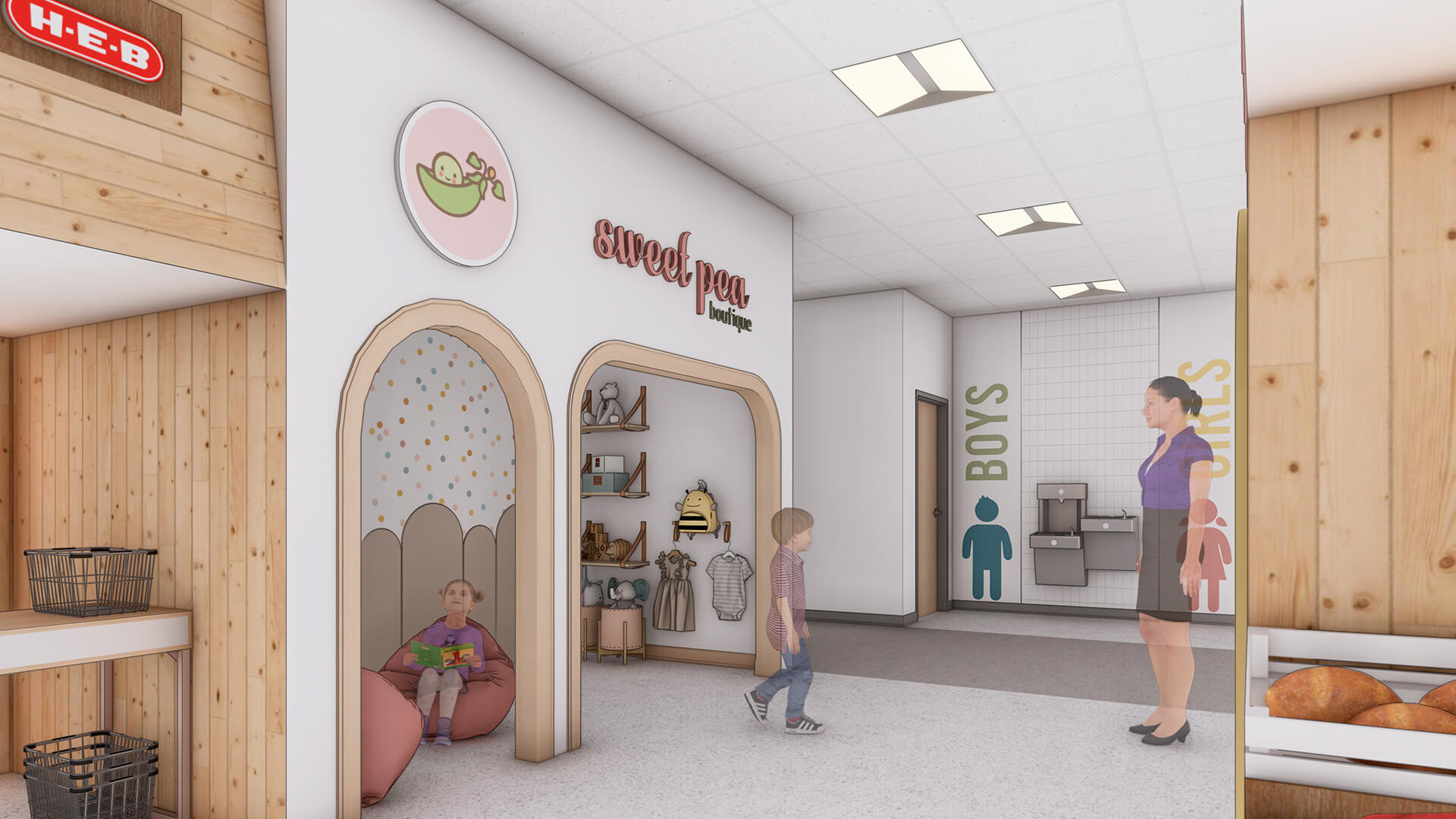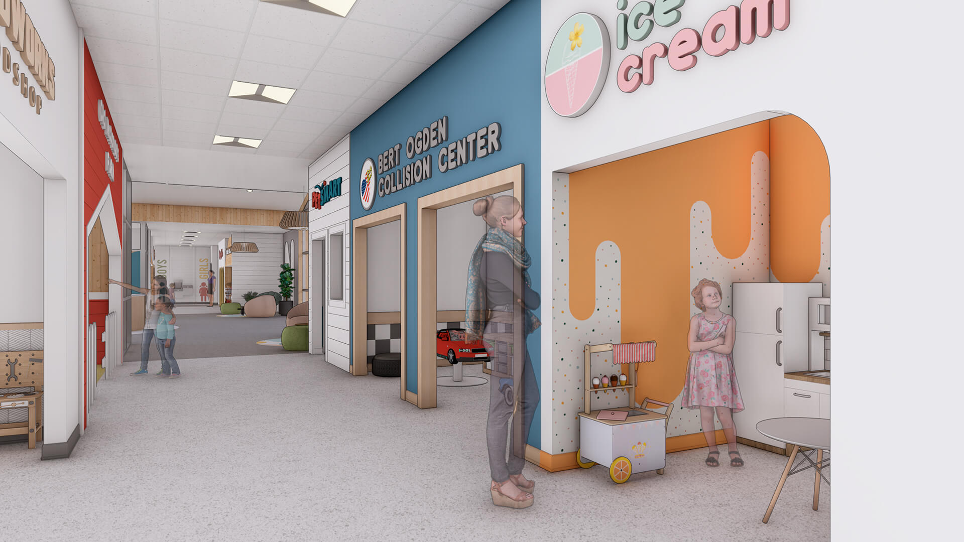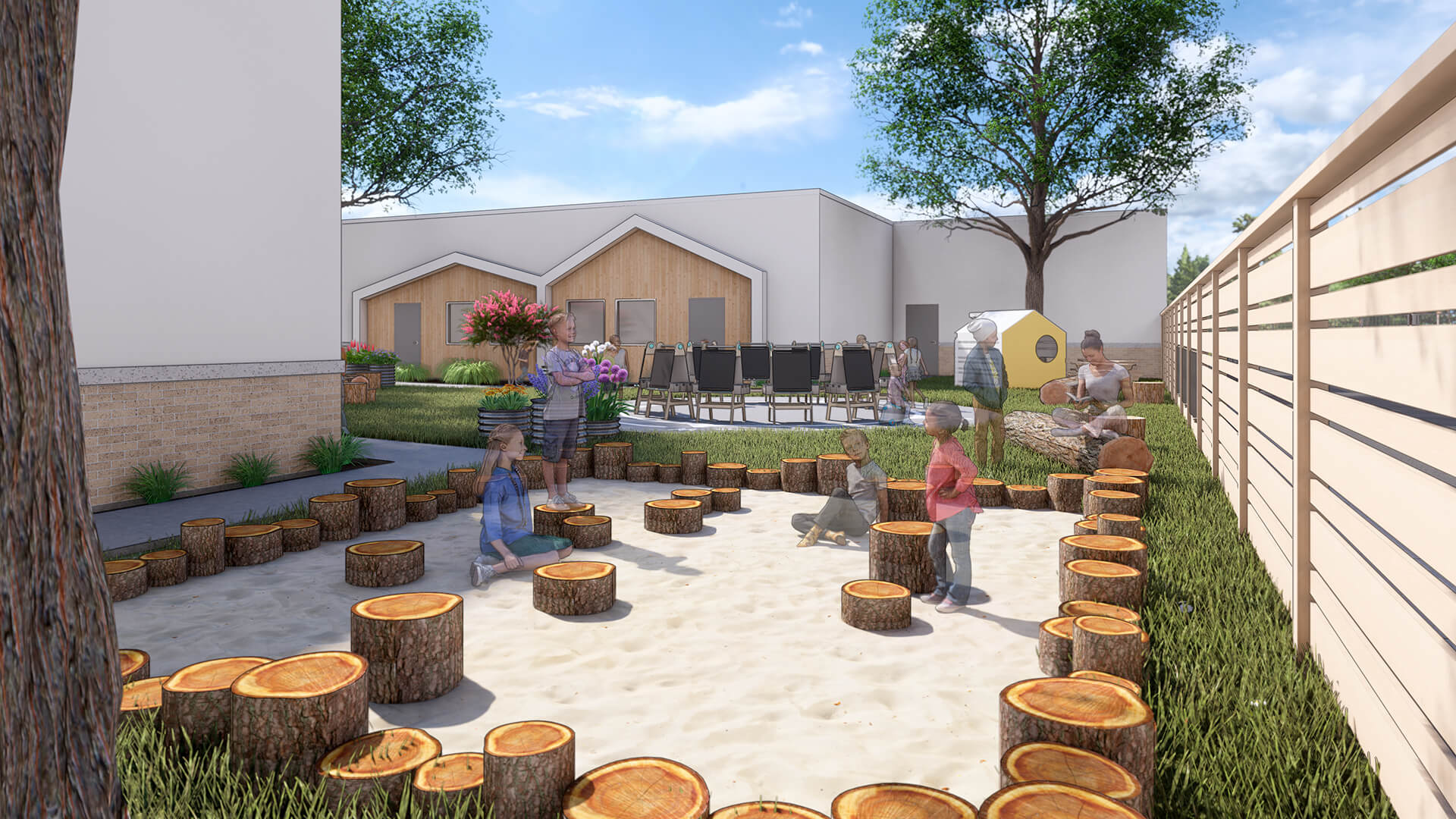 Kids Village Montessori School is designed to foster a nurturing and stimulating environment for young learners. With its welcoming façade featuring natural wood elements, large glass windows, and an open entryway, the school invites children and families into a vibrant educational space. The architecture emphasizes connection to nature, promoting a sense of community while allowing ample natural light to enhance the learning experience. Inside, thoughtfully designed classrooms support the Montessori method, encouraging exploration, creativity, and independence. The layout is conducive to collaborative learning and play, making Kids Village a perfect haven for holistic childhood development.